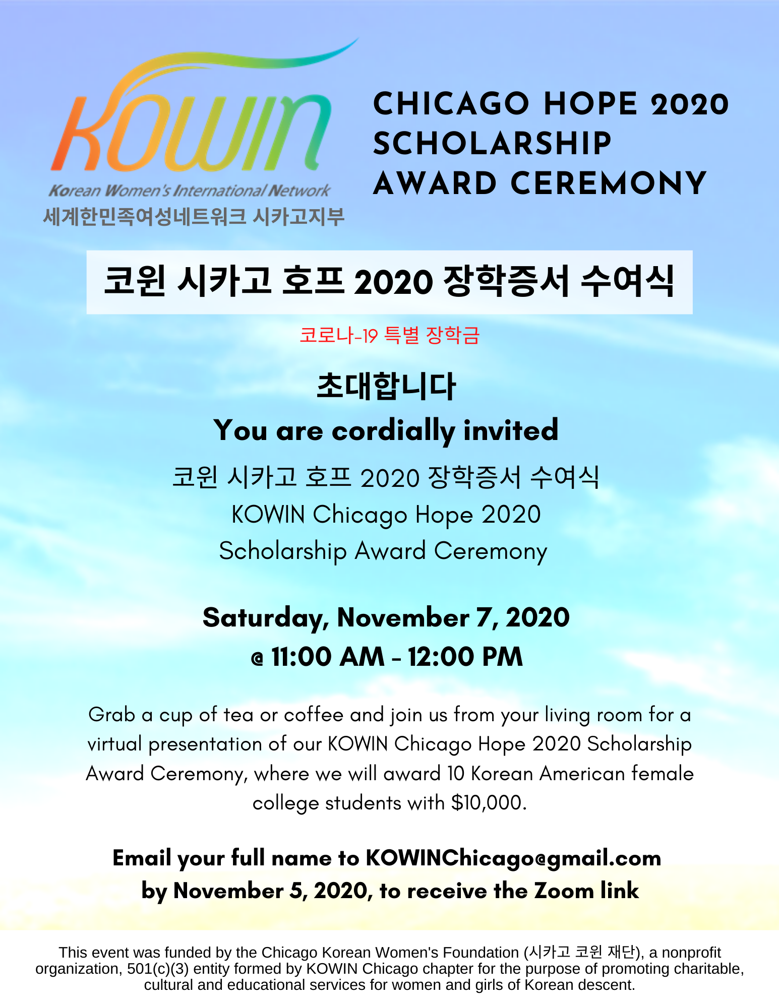 - April 15: Interview process for the fourth Annual Chicago Korean Women’s Scholarship Awardees