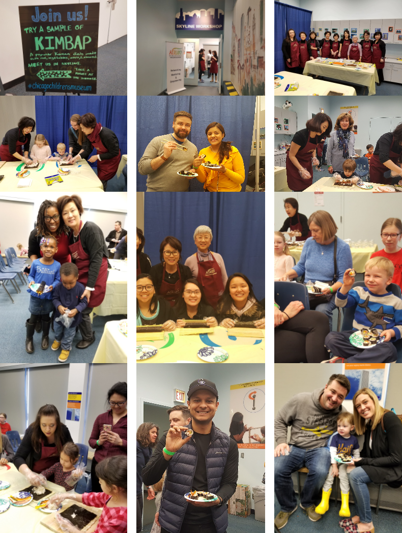 - March 11: Taste of Korea – We partnered up with the Chicago Children’s Museum to celebrate Korean culture through their Heart and Seoul: Growing Up in Korea exhibit. This exhibit allows children to experience different aspects of Korean culture, from paper crafting to learning about dol, the traditional celebration of the first birthday. KOWIN members conducted a cooking demonstration and assisted over 100 participants in rolling kimbap. All visitors had a chance to enjoy the deliciously prepared and popular Korean picnic food.