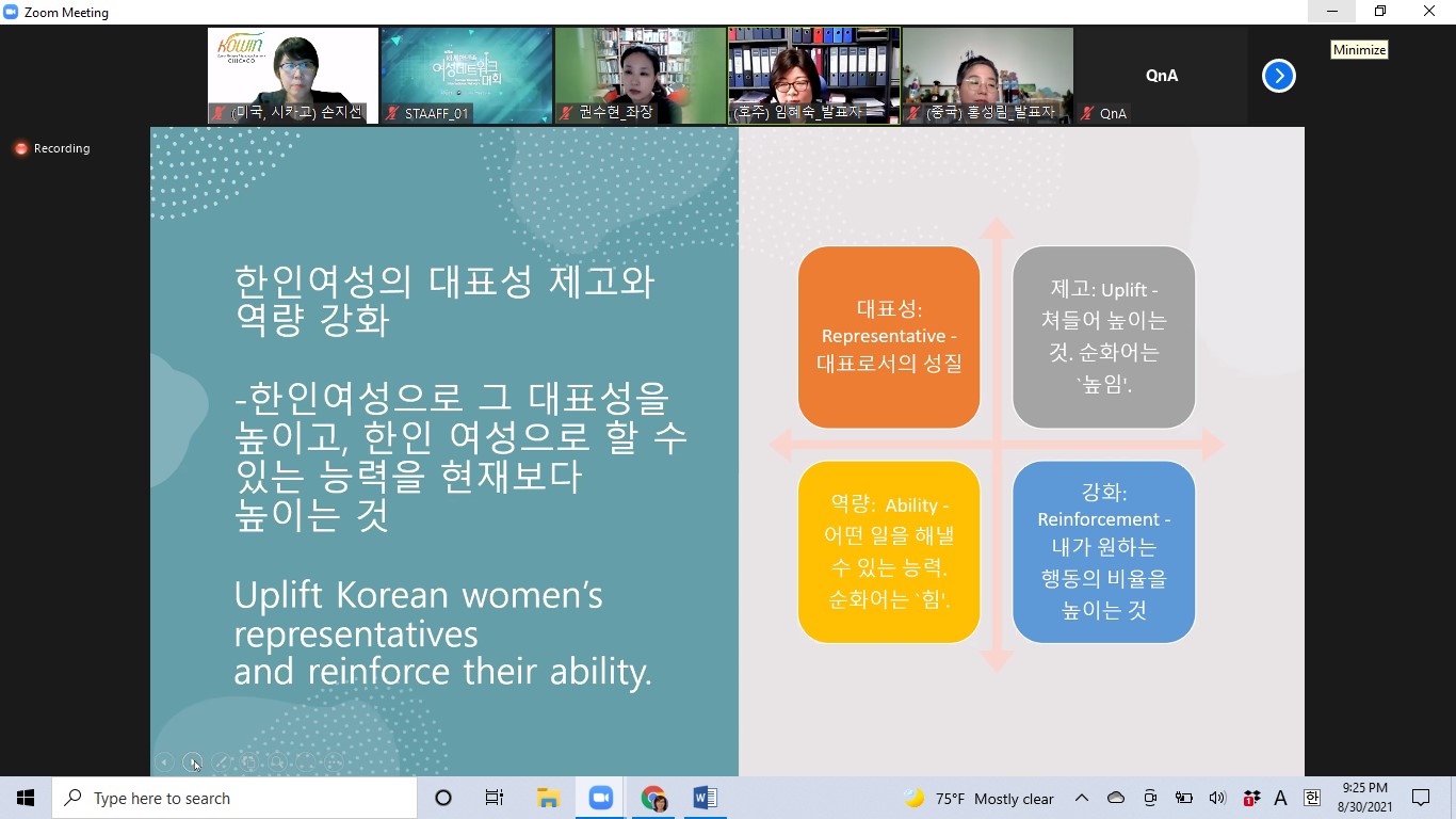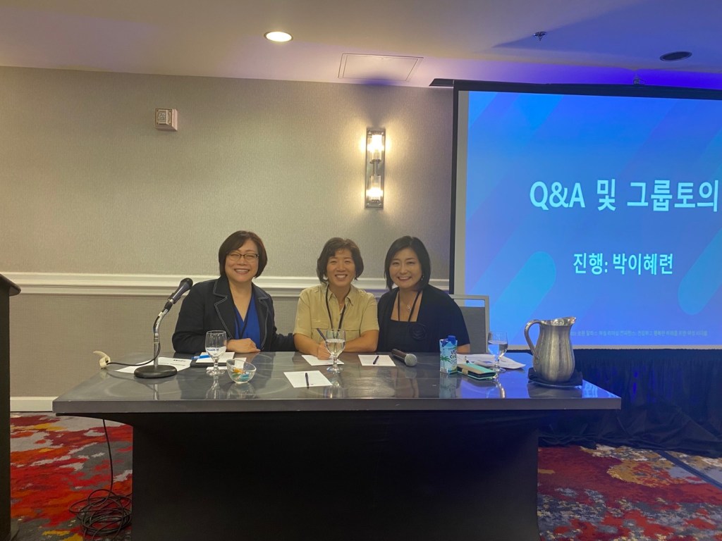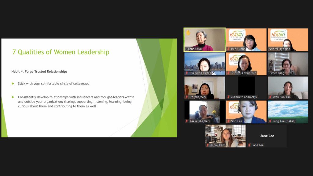 Hyeryun Lee Park from the Chicago Chapter was the keynote speaker at the conference. Her keynote presentation titled “Post COVID – New Normal Trends in Women’s Leadership” received much positive feedback and inspired attendees to reevaluate their current leadership style to meet the demands of fast-changing societal needs. Two outstanding panel members from Dallas Chapter, Dr. Gloria Cha and Professor Kyung-eun Lee provided much needed tips on how to stay both physically and mentally healthy post-COVID.