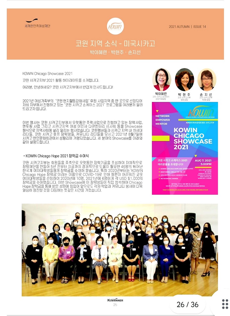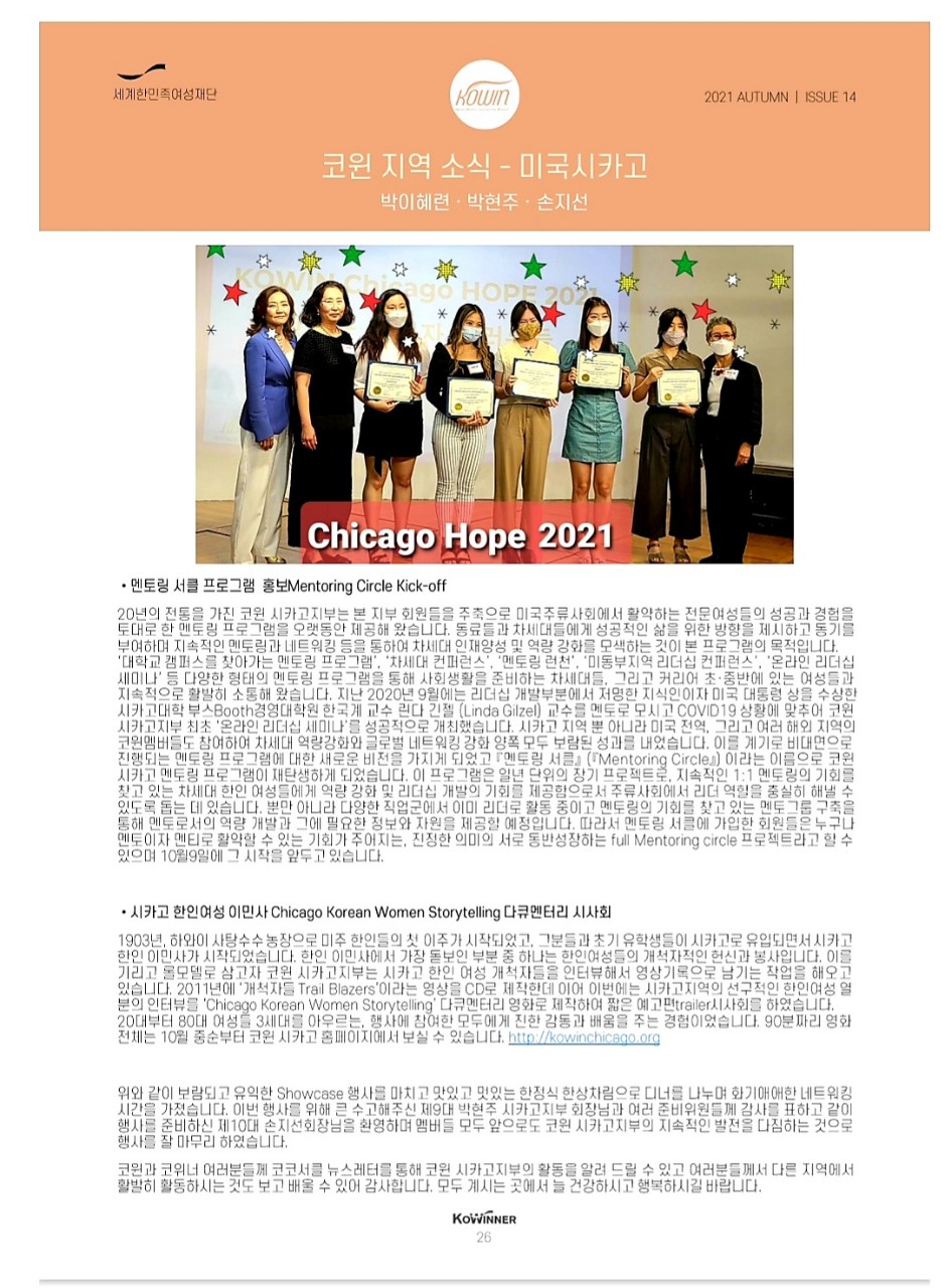 August 24-25: The 21st KOWIN Conference in Korea – “Congratulations to KOWIN Chicago Chapter for being selected as one of the recipients of the Organizational Excellence Award by the Korean Ministry of Korean Gender Equality and Family (여성가족부장관 유공표창 단체상)